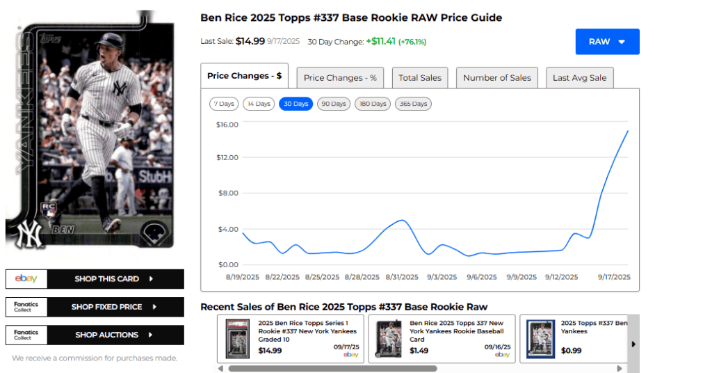 Rice’s official rookie card is part of the 2025 Topps Series 1 set with card number 337. According to SportsCardInvestor, the base version was trading for around one dollar in August. By mid September prices were moving toward sixteen dollars. This rapid increase reflects both strong demand and growing belief in Rice’s future.