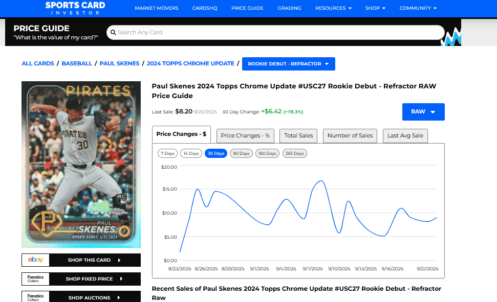 For casual collectors, this shows that demand for Paul Skenes rookie cards is strong across all price levels. Whether it is a premium one of one card or an entry level refractor, market activity signals that Skenes has quickly become one of the most collectible young stars in baseball.